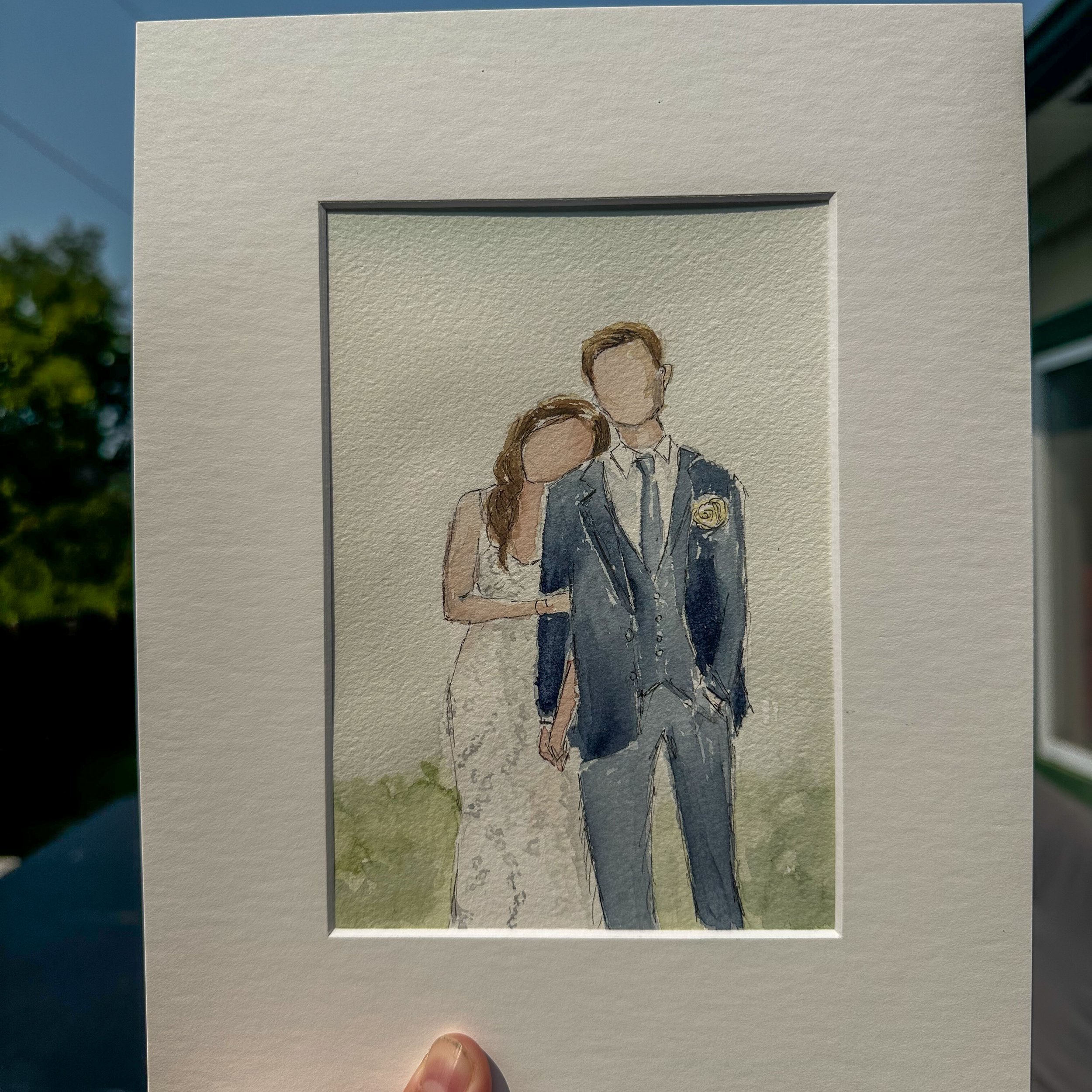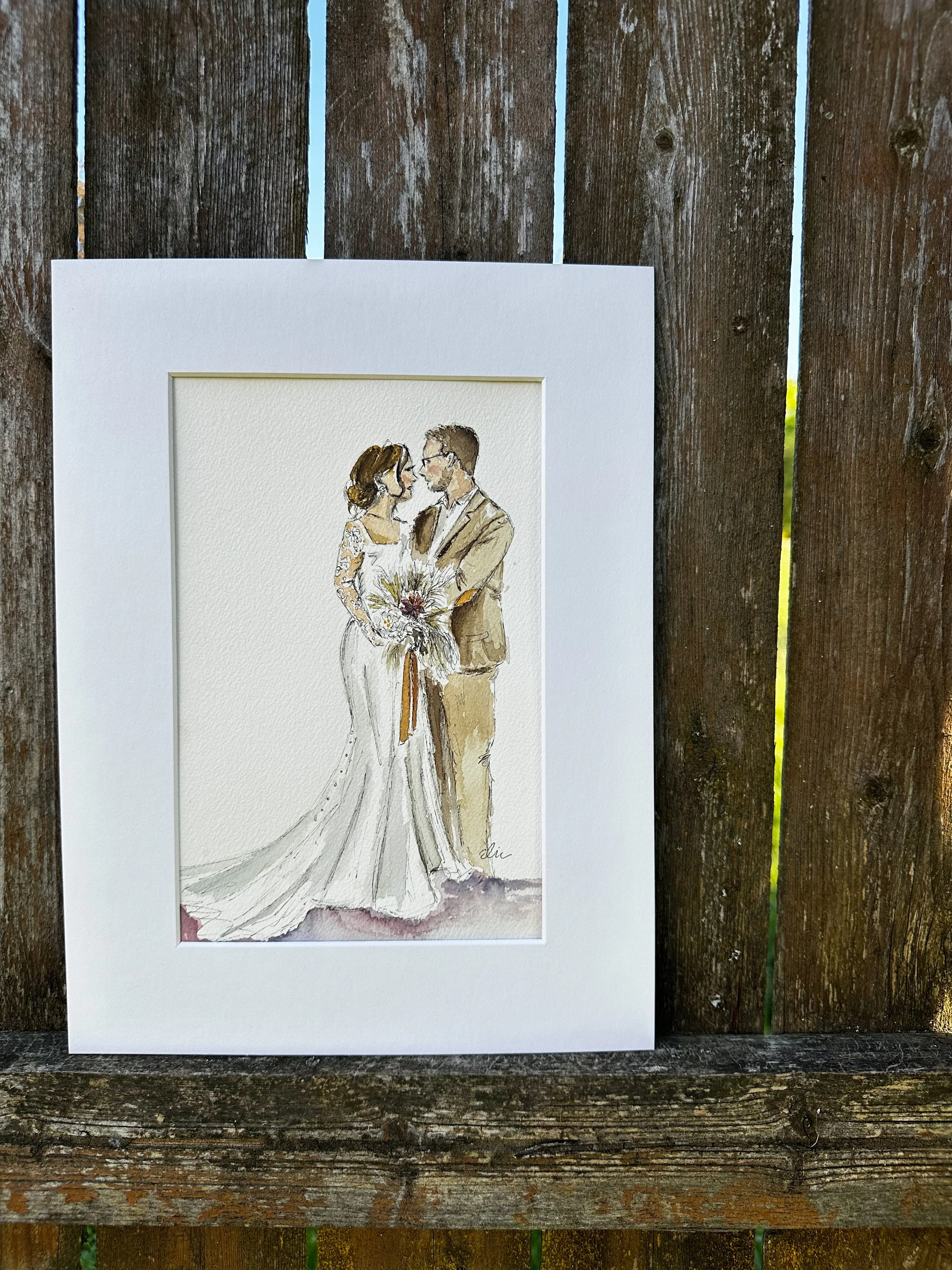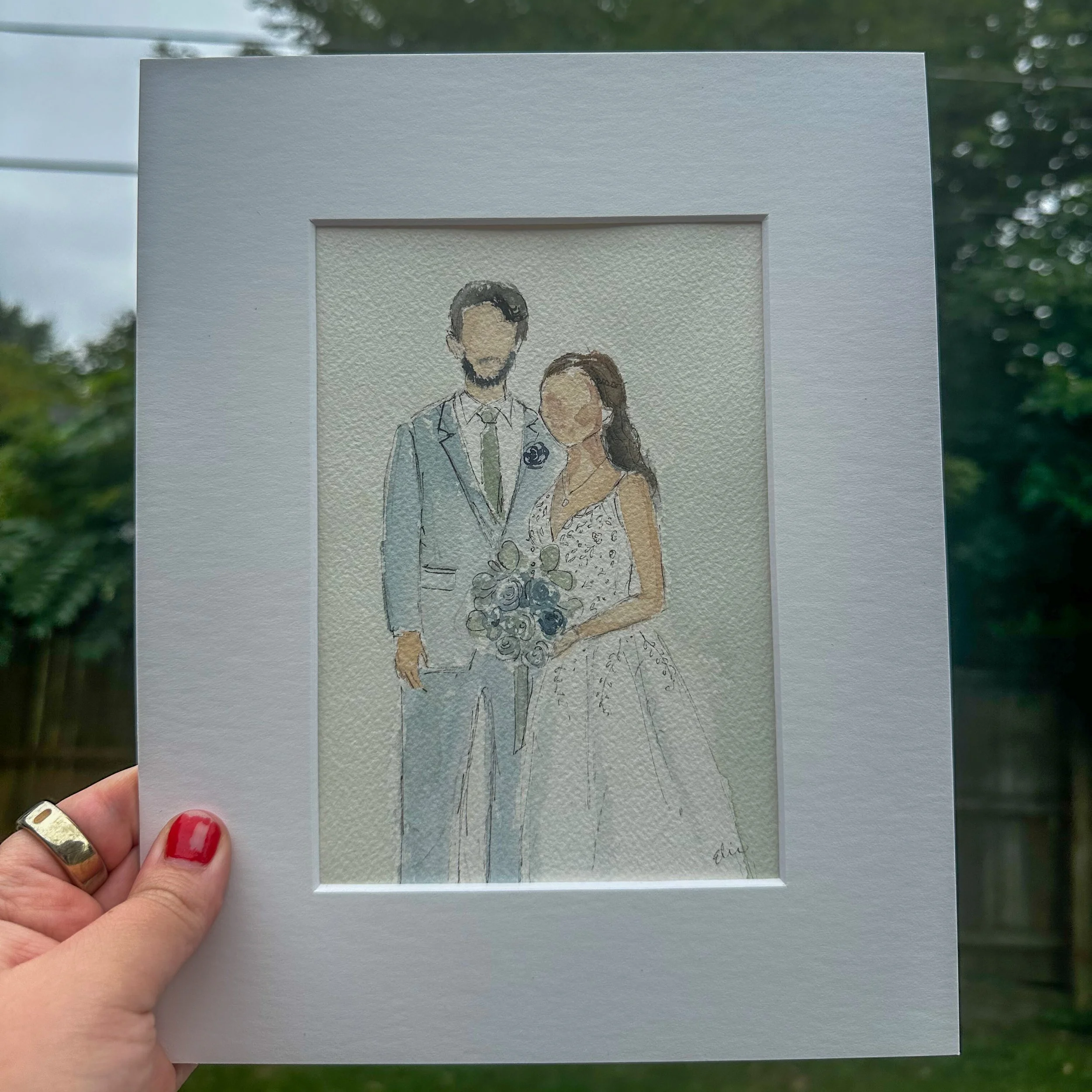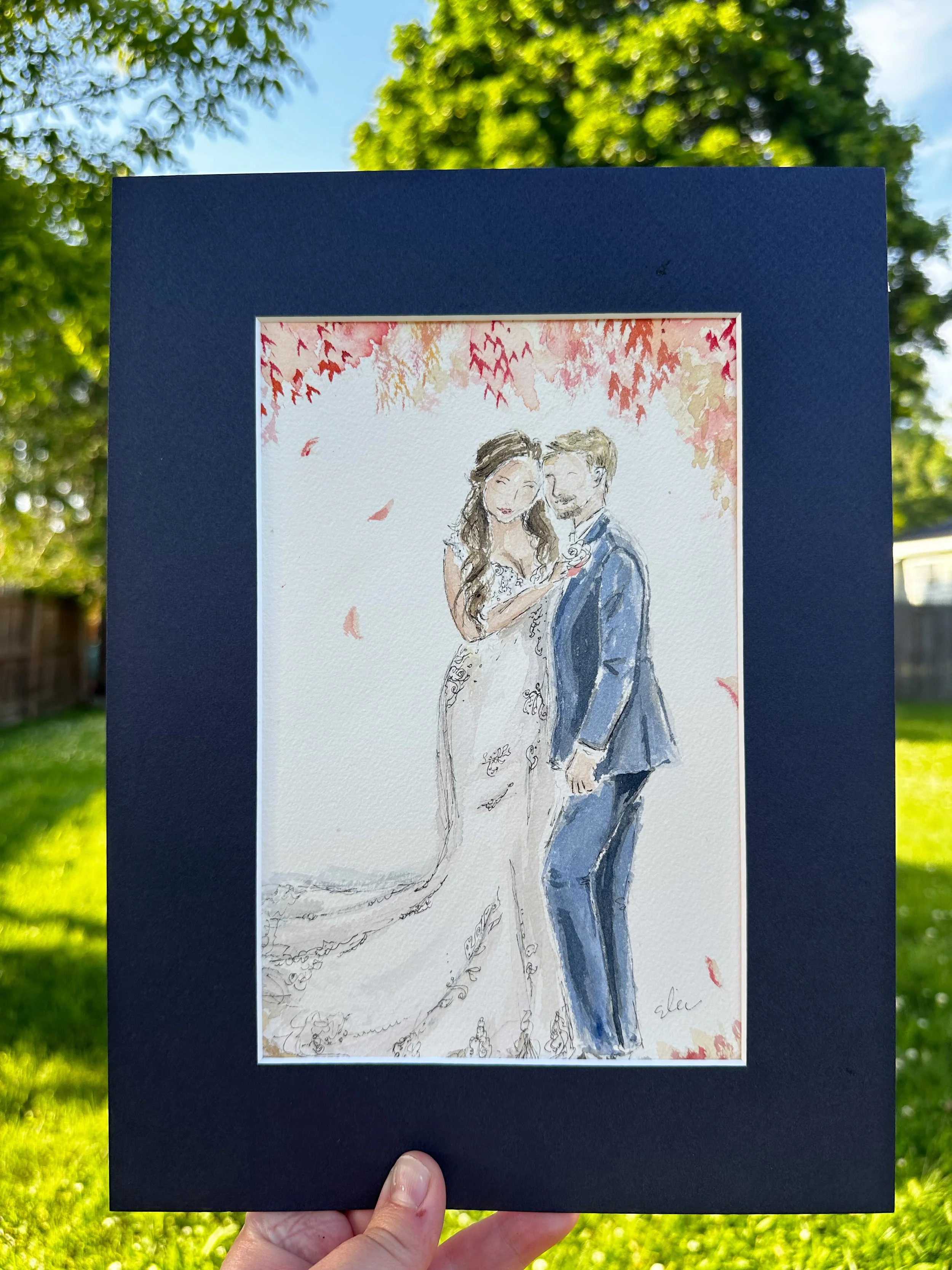 Create a meaningful memory of a joyful occasion with a custom watercolor wedding portrait. Painted on 100% cotton cold pressed paper, this original art piece arrives matted and ready for you to frame and display.