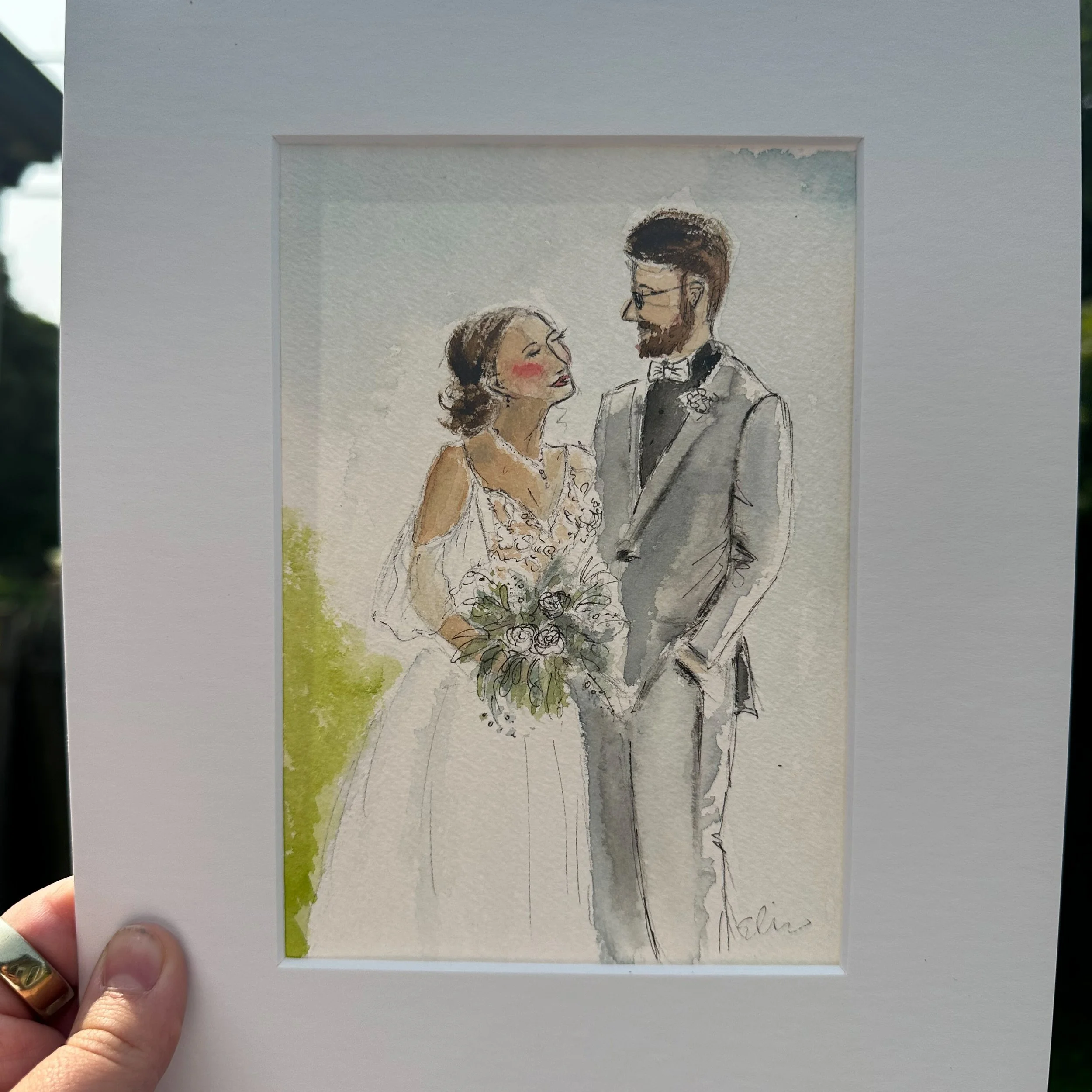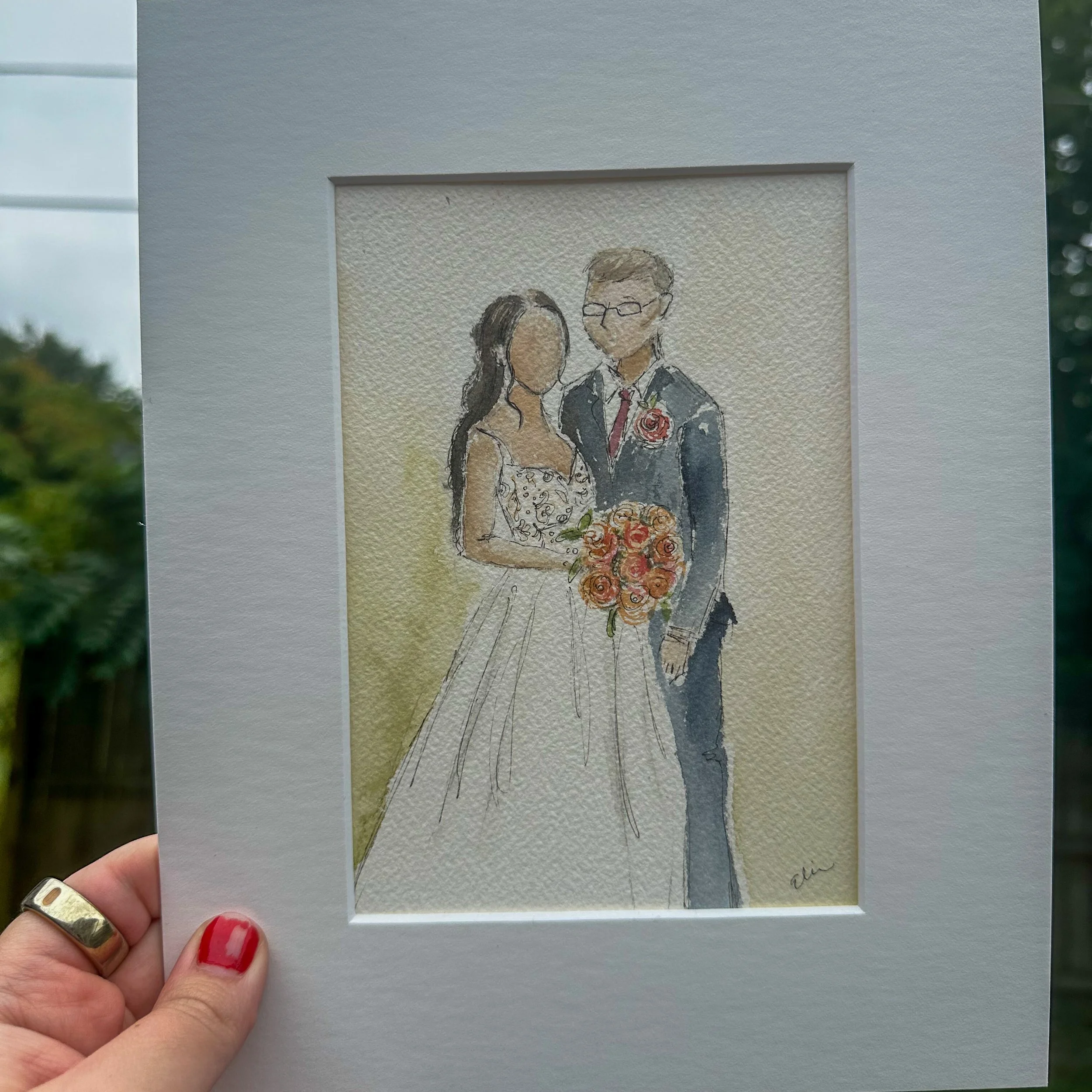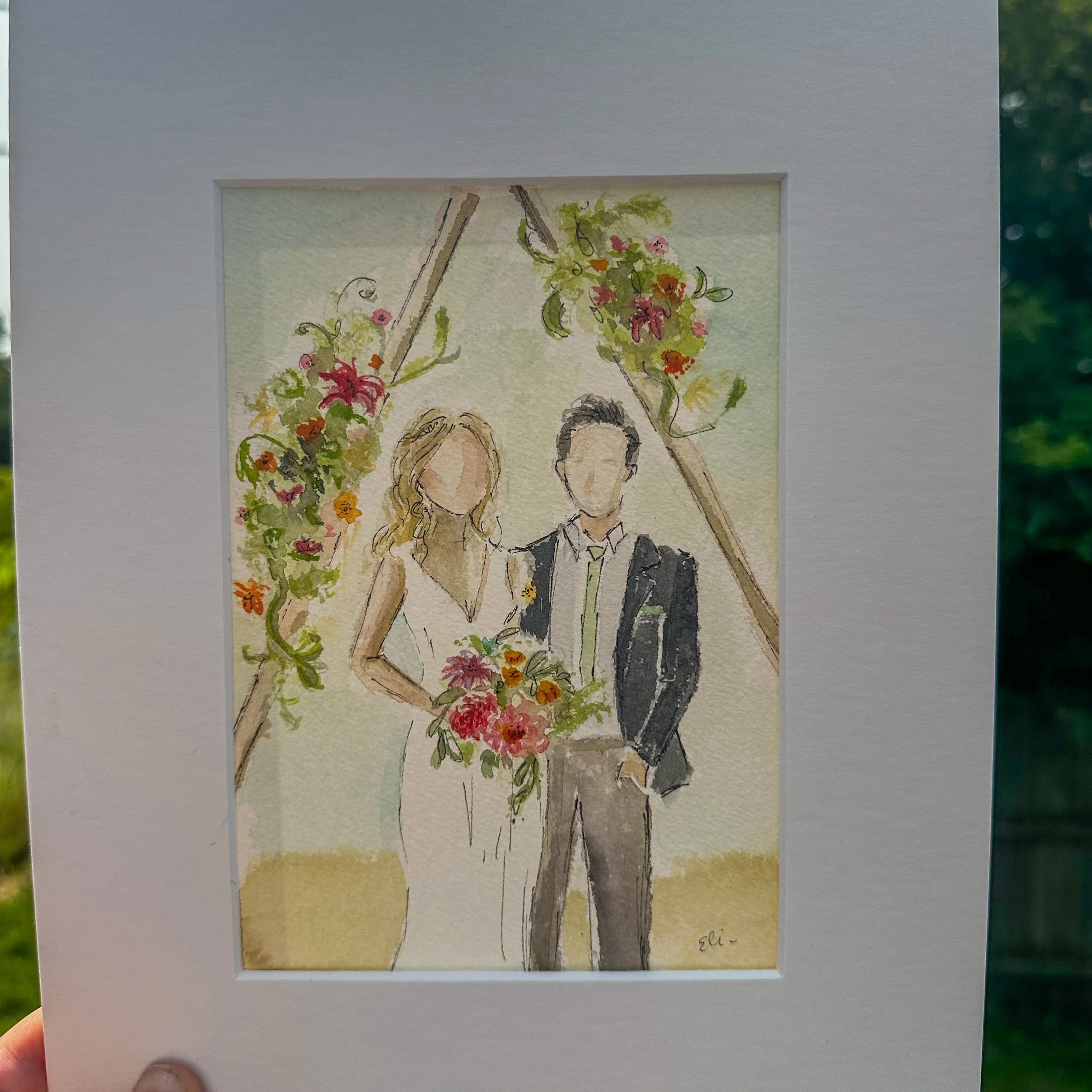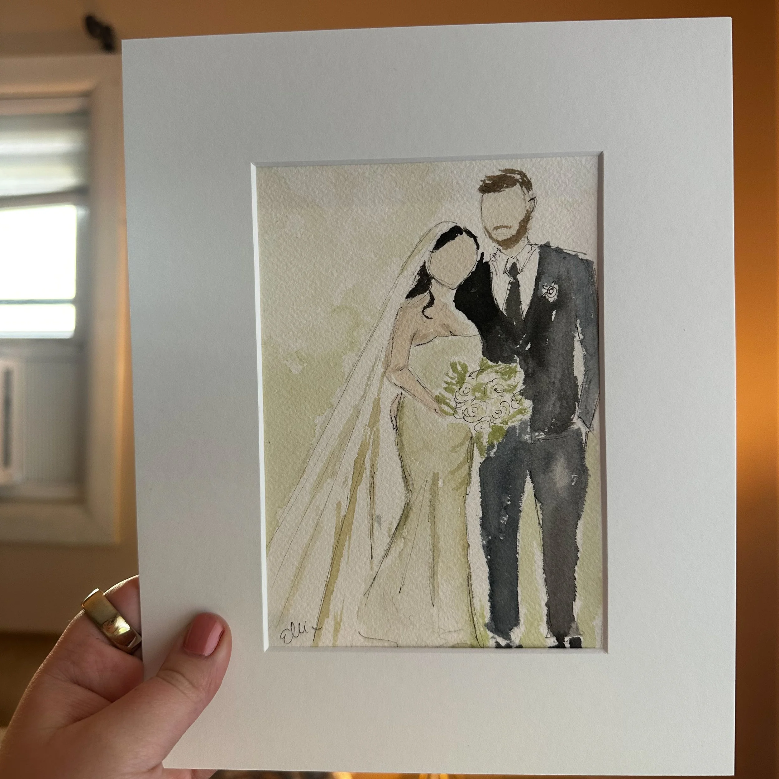 Create a meaningful memory of a joyful occasion with a custom watercolor wedding portrait. Painted on 100% cotton cold pressed paper, this original art piece arrives matted and ready for you to frame and display.